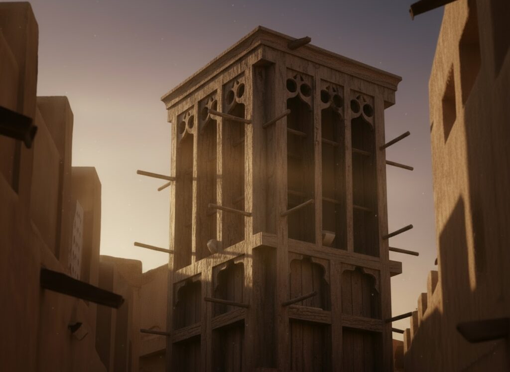 The area’s houses feature traditional wind towers (barjeel) for cooling.