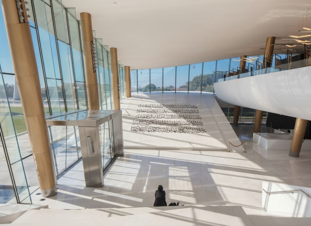 Its building is shaped like a torus with an open center, featuring Arabic calligraphy on the exterior.