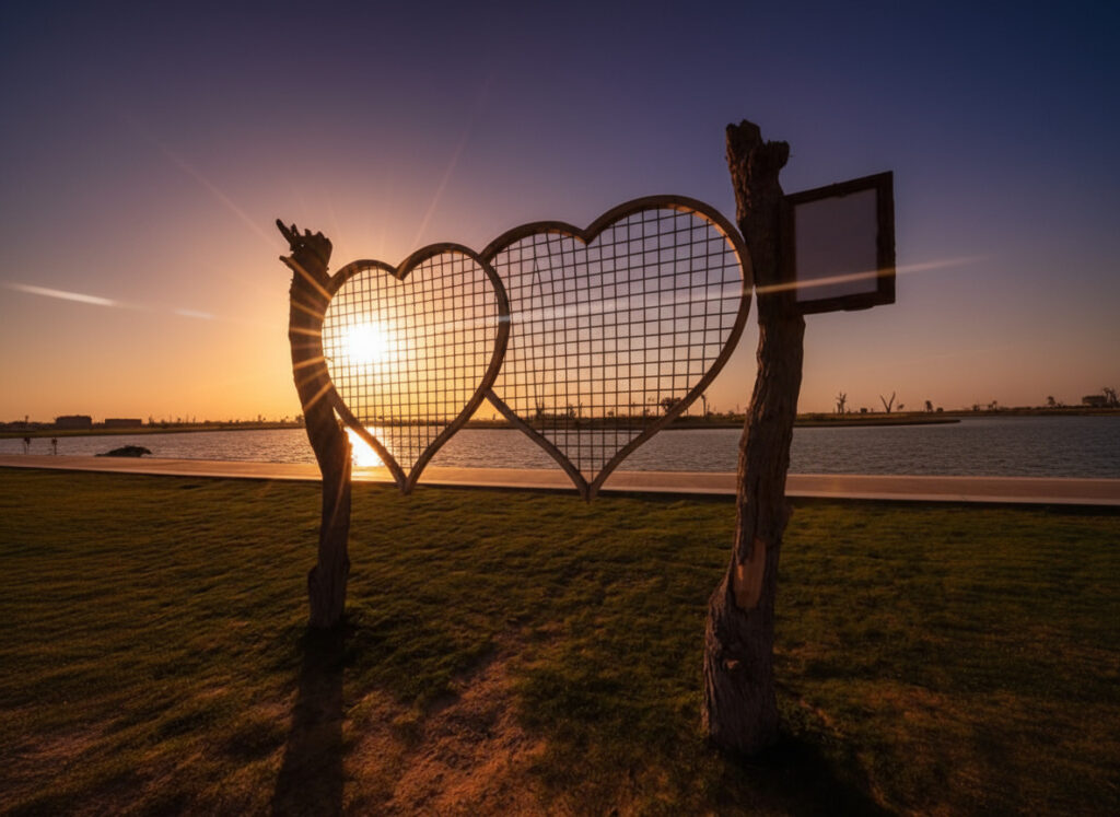 Love Lake Dubai is a heart-shaped desert oasis located in Al Qudra, Dubai. It features walking trails, picnic spots, and landscaped areas, attracting tourists and residents. Visitors can also enjoy birdwatching and scenic desert views.
