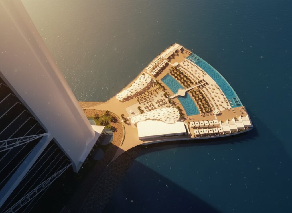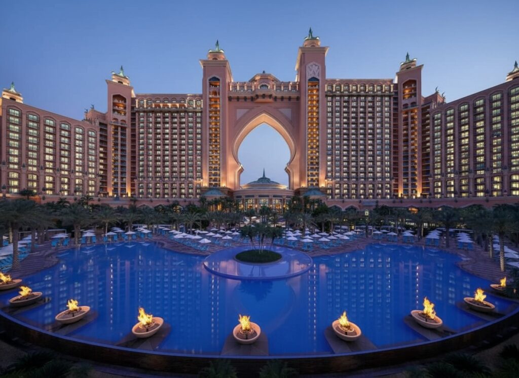 The hotel features luxurious suites, fine dining restaurants, and a helipad.