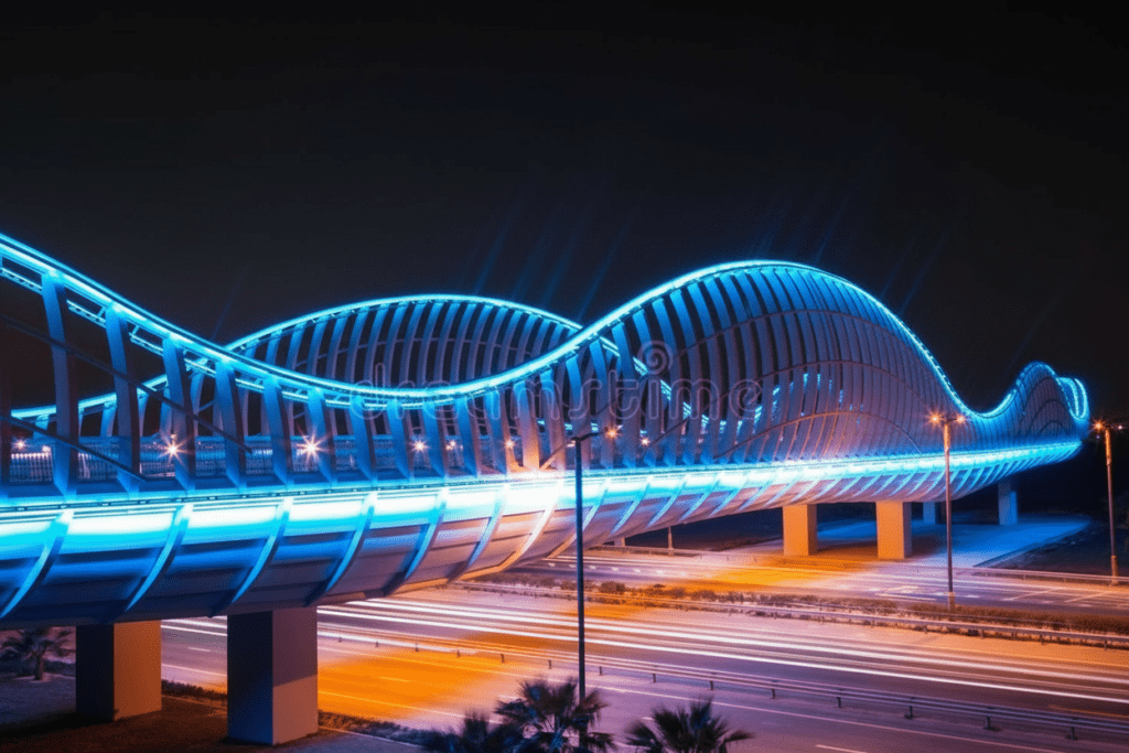 Meydan Bridge is a modern landmark in Dubai, connecting areas over Dubai Creek. It features pedestrian paths and viewpoints, attracting tourists and residents. Visitors can also enjoy views of Meydan Racecourse.